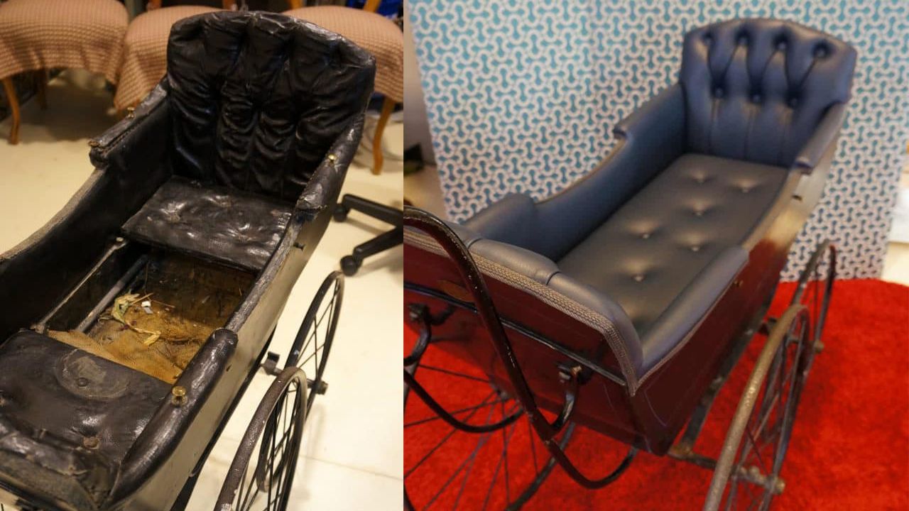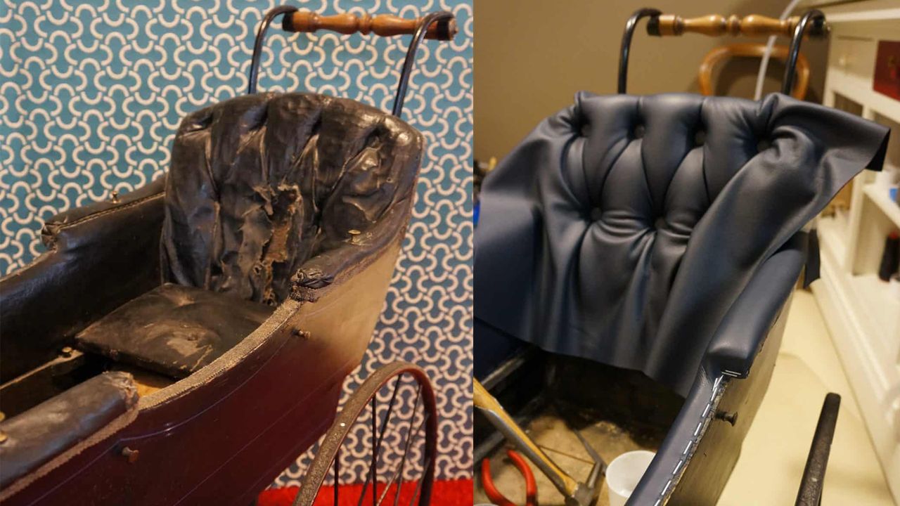 Die Entdeckung dieses alten Zwillingskinderwagens aus der Zeit um 1900 ließ das Sammlerherz unserer Kundin gleich höher schlagen. Sie brachte das Einzelstück zu uns in die Werkstatt und man hatte den Eindruck, das alte Polster und der Lederbezug würden schon vom Hinsehen zu Staub zerfallen. Doch das Strahlen in den Augen des Polstermeisters beim Anblick dieses Unikums stimmte die Kundin dann zuversichtlich!